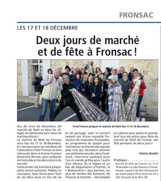 Aux côtés des artisans, producteurs et artistes, nous sommes tous impatients de vous retrouver à la salle des fêtes de Fronsac pour cette occasion!